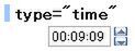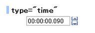 「time」を指定すると、フォームパーツは時分秒の入力欄になります。対応しているブラウザーでは時分秒を入力するコントロールが表示されます。Operaでは、datetimeと同様のステップアップ・ダウンボタン付き入力ボックスが利用できます。