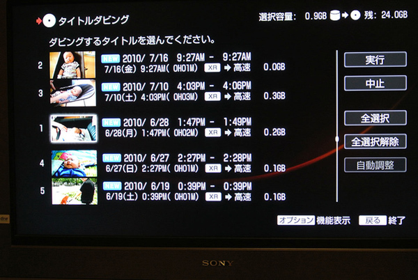 カメラからダビングした動画から、BDメディアに保存するものを選択する。このとき、選択する順序によって、BDでの動画の並びを指定することができる。また、先ほどチャプターから分割し、不要なタイトルは選択しないことで全体のムービーから削除することができる。ごくごく簡単ではあるが編集が行えるというわけだ。なお、動画を選択していくと画面右上の「残:」からBDメディアの残り容量がわかるので調整しながら動画を選択していこう。
