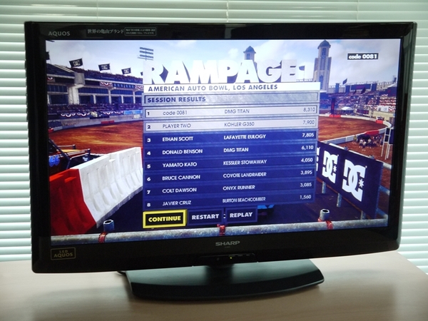 そして3本勝負のファイナルバトル(いつの間に3本勝負に!?)。コードマスターズ・浅海さんの提案で、ゲームモードはRAMPAGEで。これはスタジアム内で、どんな手段を使ってもいいからライバルたちを蹴散らすというルール無用のデスマッチだ。ライバルにぶつけるとポイントが溜まり、そのスコアを競うモードである。クルマには体力のようなものがあり、これをゼロにすると完全破壊で高得点がもらえる。当然、自分も破壊される危険性があるが。動けなくなっても、一定時間すれば復帰できるので、時間が許す限り破壊しまくれ!