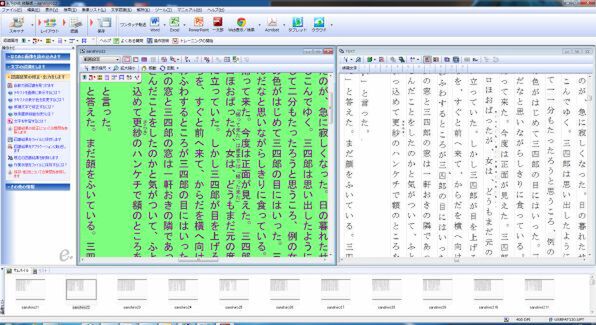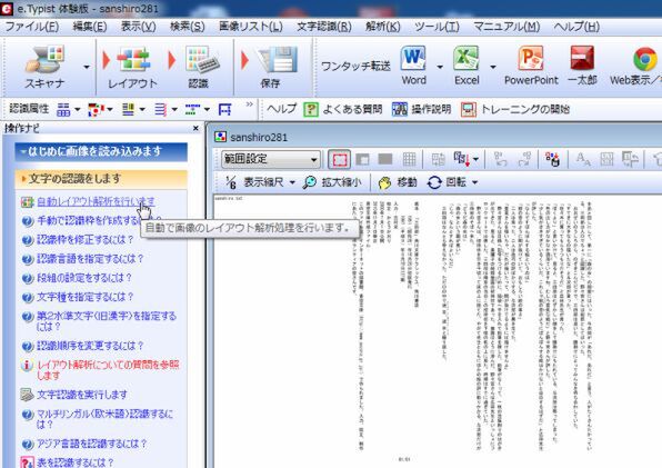 「e.Typist」は画面左側にナビゲーションメニューが表示され、やりたいことをクリックすれば作業を進められるようになっているのが便利。わかりにくい作業にはヘルプも用意されている。「三四郎」はA4用紙で約160枚分のデータで、読み込みだけでも約3分かかった。レイアウトを認識させたら、認識開始。全ページの認識には3分10秒かかった。これは、想像よりもずっと速かった。「Phenom II X6 1090T Black Edition」(3.2GHz)のCPUと16GB搭載したメモリーのおかげだろうか。