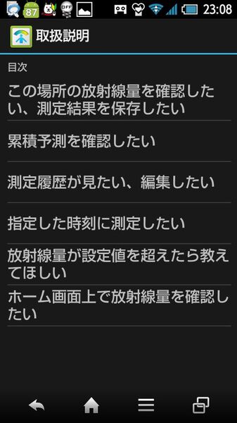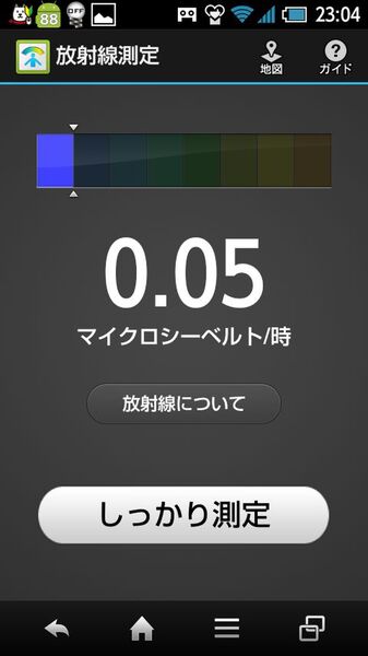 Xperia SXとOptimus itは新機種として乗り換えて購入する場合、案外目新しさが少なめだったが、PANTONE 5は「放射線測定」ができるスマホ初の機能を搭載する。ウィジェットで常時測定し続けられるほか、精度の高い測定を行う「しっかり測定」も可能。この場合は数十分単位での計測になるのでテーブルの上に置くなどして動かないようにしなければならない。手で持って1、2分程度の測定では精度を示す星はほとんど1つ点灯するだけというレベルなので個人的には「しっかり測定」がメイン利用ではないかなと感じられた。とはいえ操作がシンプルで、取扱説明書がその場で確認できるほか、測定履歴も残っており、表示もわかりやすいので使いやすくはある。