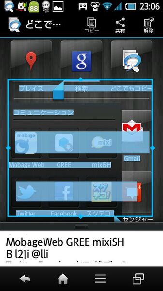 また、上位モデルのAQUOS PHONE Xxと共通の機能が「どこでもコピー」。これは有効にしておけばステータスバーを開いて、どこの画面の文字でも自動で認識して、テキストデータのコピーが可能だ。