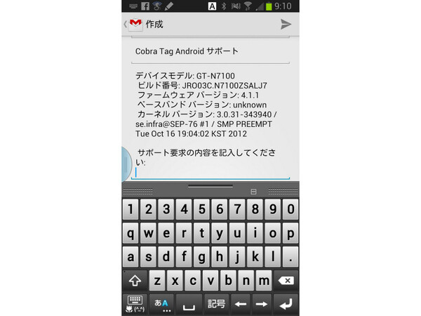 小さなCobra Tagではあるが、スマホと連携することで、いろいろ便利な機能を提供してくれる。例えばアプリケーション設定のメニューにある「電子メールサポート」の場合、Cobra Tagに関して不明点や質問などがある場合はサポートへのボタンをタップするだけで、宛先やスマホの機種固有情報が最初から入力された状態でメールアプリが起動する。あとは質問など、メール本文を入力するだけでいいようになっている。