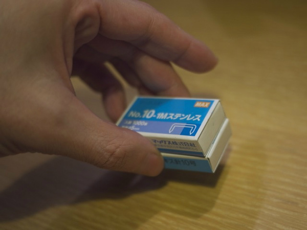 マッチ箱でも、ホチキスの針の箱でも、何でも良いので同じ種類の空箱を2~3つ用意します。片手で持ち上げるサイズの箱が適しています。そのひとつに、十円硬貨を一杯にいれます。ホチキスの針の箱なら14枚ほど十円硬貨が入るはずです。他の箱は空にしておきます。