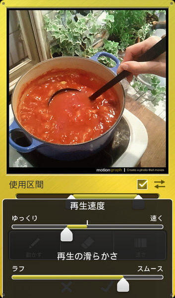 アプリの使い方もとてもカンタン。動画を撮って動かしたい部分(と動かさない部分)をこすって指定し、保存するだけだ。数~数十秒でGIF形式のアニメーションが書き出される。クオリティーにこだわりたいなら、編集機能を使うといい。動き始めと、終了のタイミングを指定したり、動きの速度や滑らかさを調整できる。