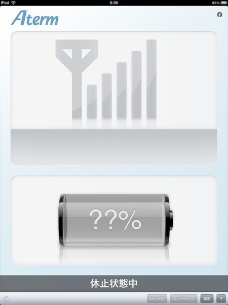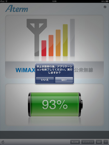 iPhone/iPadの場合、「Aterm WiMAX Tool for iOS」から休止の指定を行なえる。アプリ上からリモート復帰ができない点が残念だが、インターネットアクセスが不要になった時点で即座に休止状態にできるため、自動的に移行するのを待つよりずっと効率的だろう。