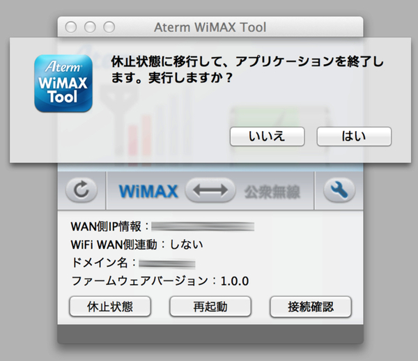 AtermWM3800Rを休止状態にするには、「Aterm WiMAX Tool for Mac」を起動して「休止状態」ボタンをクリックするだけで、即座に実行される。