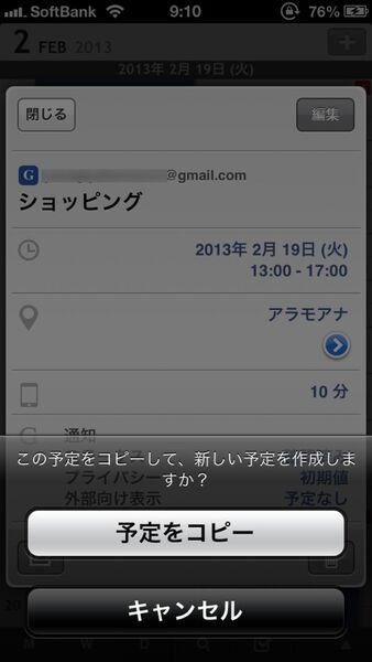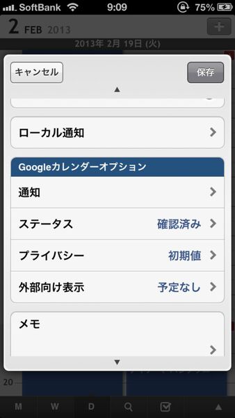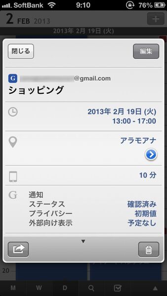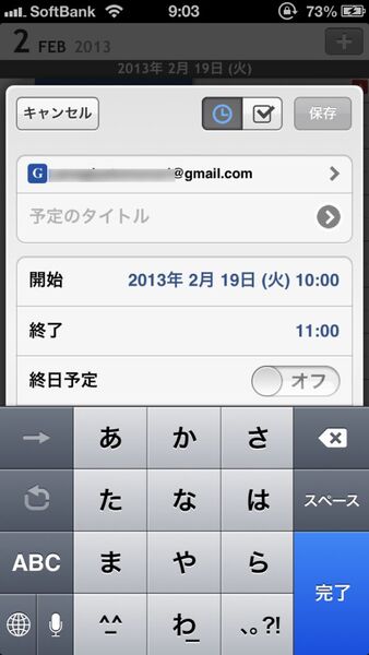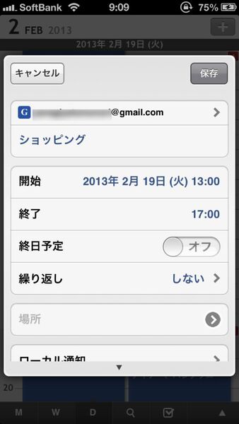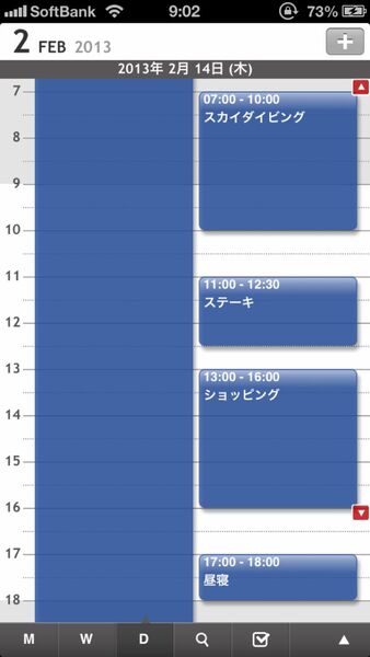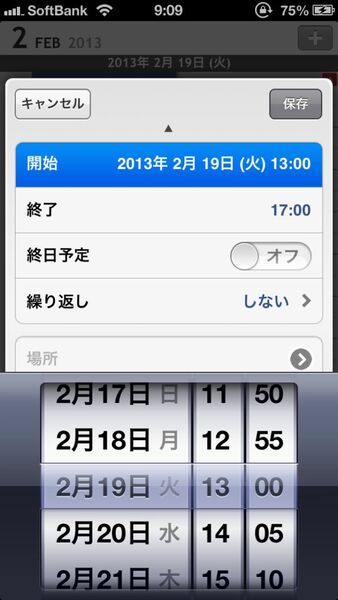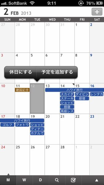 月間/週間/1日のカレンダーでは、左右にフリックすることで、前後のカレンダーを表示できる。1日24時間表示で早朝や深夜帯を表示するなら上下にスクロールさせればいい。予定をタップすれば詳細画面が開く。新規項目を作成するなら、月間カレンダーで日付を長押しするか、画面右上の「+」アイコンをタップする。また、ヘッダーの中央をダブルタップすると、カレンダーの一覧を表示できる。