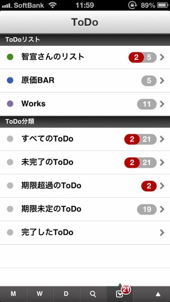 ToDoが少ないなら予定として管理してしまうのもありなのだが、数が増えるとタスクとして処理するほうがいい。「ToDo」アイコンをタップすれば、ToDoリストを一覧できる。