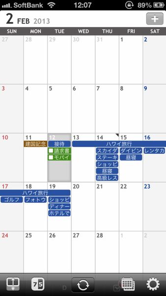 画面下のアイコンをタップすることで、月間/週間/1日のカレンダーを切り替えられる。そのほか、リスト表示して予定を探せる検索画面とToDoも用意されている。