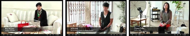 宮田理江氏(ファッションジャーナリスト)は旬トレンドや時流をとらえた記事を発信。動画内では13年の春夏シーズンのトレンドをビジネスシーンに取り入れるポイントとコーディネートについて紹介する。戸部千恵美祖(スタイリスト)は、今シーズンのマストハブなお仕事用アイテムとコーディネートについて紹介する。ATSUSHI氏(PR コンサルタント)は今シーズンのメンズ、レディースとそのコーディネート方法について紹介する。