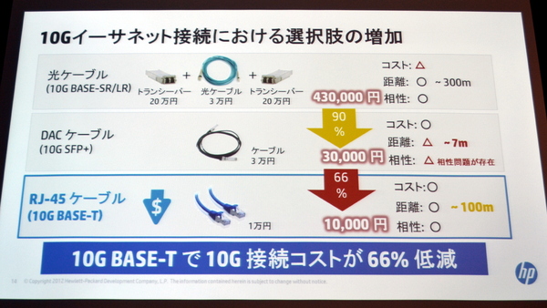 また、HP初となる10GBASE-Tへの対応も大きな目玉だ。10GBASE-Tは取り回しの楽な銅線(CAT6EやCAT7)を用いた10GbpsのEthernet規格で、高価なトランシーバーやケーブルが必要な光ファイバーによる接続やSFP+のインターフェイスを銅線でつないだダイレクトアタッチケーブルより、コストを下げられるという。「ダイレクトアタッチケーブルよりも66%オフになる。100mという伝送距離も実現する」(尾﨑氏)とのことで、今後とも10GBASE-Tの製品を積極的に投入していくという。