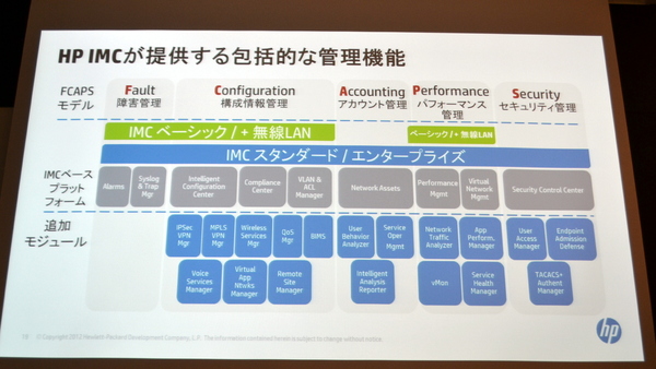 ソフトウェアではネットワーク管理ツール「HP Intelligent Management Center」の強化が発表された。HP Intelligent Management Center(IMC)は物理ネットワークはもちろん、仮想化環境、有線と無線LANなどのネットワークを統合的に管理できるソフト。尾﨑氏は「有線LANにおいては仮想化により物理デバイスが減るが、無線LANはアカウントもデバイスも増加傾向」と述べ、特に有線と無線を統合したネットワーク環境でこうした管理ツールが必要だと述べた。