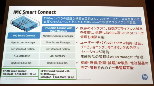 これに加え、BYOD(Bring Your Own Device)を目的としたインフラの構築を迅速に行なう「IMC Smart Connect」および「IMC Smart Connect WLAN」を追加した。LinuxとIMC Standard、SQL DBをベースにアクセス制御・認証やプロビジョニング、モニターなどを可能にするソフトウェアを組み合わせ、仮想アプライアンスとして提供する。