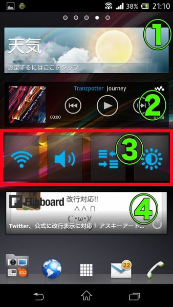 最後に、おすすめのウィジェットなど中心に、ホーム画面のカスタマイズの一例を紹介する。ウィジェットは、「Xperia Z」にあらかじめプリインストールされているソニー純正のものと合わせて、Google Playから入手できるものも、いくつかピックアップしてみた。スケジュールがすぐに確認できるカレンダーや、知りたい情報が一目でわかる天気・ニュース系、ワンタッチでオンオフできるWi-Fi設定などが便利なので、試してみてほしい。