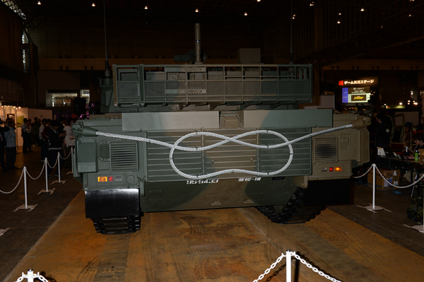 搭載している武装は、44口径120mm滑空砲と12.7mm重機関銃、74式車載7.62mm機関銃。新型の44口径120mm滑空砲は90式のの44口径120mm滑腔砲のラインメタル社のライセンス生産品ではなく、新た日本製鋼所が開発した新型で、従来のものより軽量かつ協力と言われている。今回の目玉展示ということもあり、初日から多くの人が見学に訪れており、車体の前でポーズを決めて記念撮影をする人の姿も多数見られた。