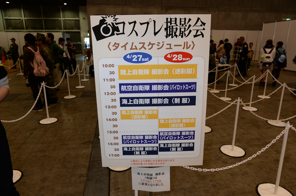 昨年も大人気だった迷彩服を着て写真撮影ができる「コスプレ撮影会」が、今年はパワーアップ! 昨年にひき続き陸上自衛隊の迷彩服に加えて、海上自衛隊の制服、航空自衛隊のパイロットスーツが用意されていた。