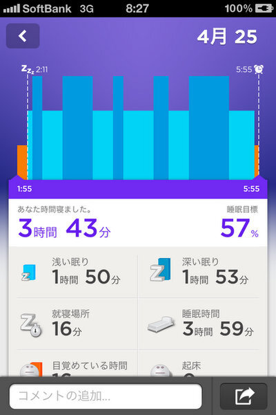このように、人類のほとんどがだらだらと使い続けられる製品とはいえ、ひとつだけ問題があります。それは1日1回必ず手動で「就寝」と「起床」を切り替えなければならないこと。一度だけボタンを長押しすれば済むことですが、それすら面倒で忘れてしまうんですね、人類は(と一般化して誤魔化そうとしているものの、実は私が)バカだから。