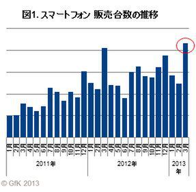 スマートフォン販売は、2013年に入ってもプラス成長を続けており、販売の多い1-3月期は数量前年比9%増となり、過去最高の販売台数を記録した。スマートフォン好調の背景には、フィーチャーフォンからの移行に加え、スマートフォンからの買い替えがあるという。スマートフォン市場が急拡大した2010年から2年が経ち、割賦支払いを終えたスマートフォン利用者が端末を順次買い替えている。