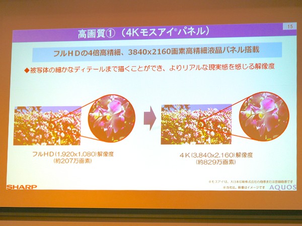 また、従来のAQUOSシリーズと比べると、量販店店頭において、これまでのように画面の明るさを重視した展示ではなく、「4Kならではのリアル感にこだわっていく」(シャープ デジタル情報家電事業本部液晶デジタルシステム第一事業部・戸祭正信事業部長)などとし、「ICC PURIOSおよびAQUOSで培ったパネル技術を惜しみなく投入したAQUOSの新シリーズになる」と位置づけた。