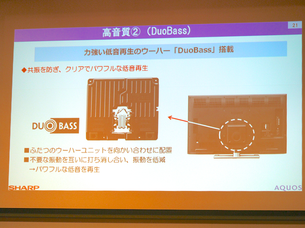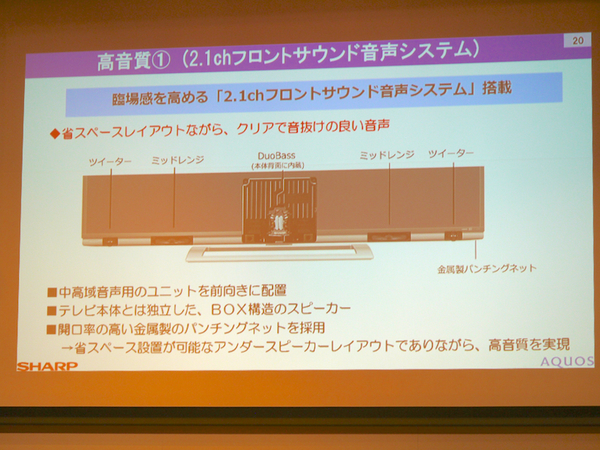 「2.1chフロントサウンドスピーカーの採用によって、省スペース設計が可能となっている。これにより、2005年12月に発売したサイドスピーカーを搭載した57型液晶テレビの165.2cmの横幅に対して、70型のLC-70UD1では157.8mmの横幅であり、同じスペースに10インチ以上大きなテレビを設置できる」(戸祭事業部長)などとした。
