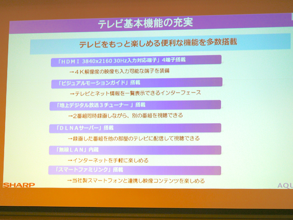 一方で、テレビの基本の充実としては、「HDMI 3840×2160 30Hz入力対応端子」を4基搭載したほか、テレビとネットの情報を一覧表示できるビジュアルモーションガイドの搭載、地上デジタル放送3チューナーの搭載、スマートファミリンクの搭載など、AQUOSブランドならではの機能を採用したという。
