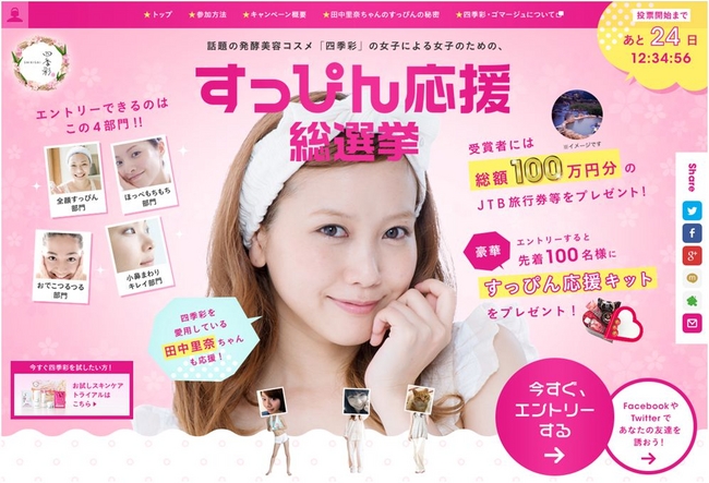 受賞者には、JTB旅行券、モデル田中里奈さんがプロデュースする「Dear」のアクセサリー、「四季彩」のセットなど総額100万円分の賞品をプレゼントする。また、同選挙にエントリーすると先着100人に、「四季彩 ピールオフ ゴマージュ」などが入った「すっぴん応援キット」を用意している。