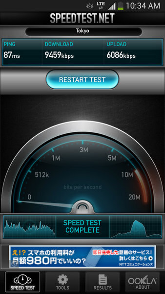 通信速度は場所や時間帯によって異なるが、4~9Mbps程度という結果となった。スペック上の最大通信速度は下り112.5Mbps/上り37.5Mbpsだが、現段階でこの速度が出るのはごく一部の限られたエリアのみ。実際の計測結果としてはまずまずの速度である。これならば、ドコモのサービスとほとんど変わらないと言えるだろう。