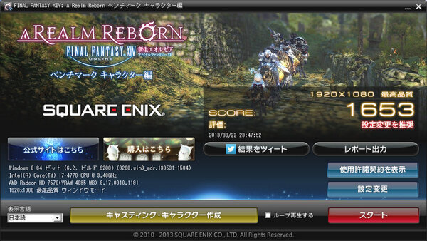 「ファイナルファンタジーXIV: 新生エオルゼア ベンチマーク キャラクター編」では1920×1080ドットの「最高品質」でスコアが「1653(設定変更を推奨)」、「標準品質(デスクトップPC)」で「3213(やや快適)」という結果だった。最高画質でプレーするには少々厳しいが、標準的な画質ならストレスなくプレーできるだろう。