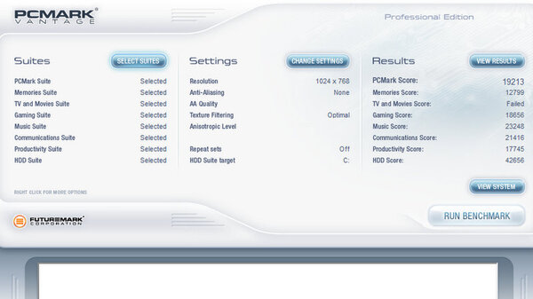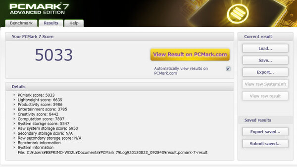 マシンの総合的な性能を計測する「PCMARK7 v1.4.0」と「PCMark Vantage 1.2.0.0」では、それぞれ「5033」、「19213」とかなり高めのスコアとなっている。このふたつのベンチマークはストレージ性能に強く影響されるため、SSDの効果が出ているものと思われる。