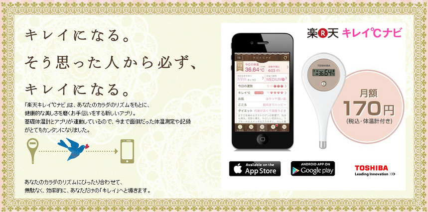 「楽天キレイ℃ナビ」は、東芝が開発した専用の基礎体温計を用いて測定したデータを、スマートフォン端末に転送し、専用のアプリケーション上で管理できるサービス。計測40秒、体温データ転送に2~3秒と毎日1分弱の計測の習慣化を実現する。アプリの主な機能として、日々の基礎体温管理や次回生理日予測、排卵日予測などのコンテンツに加え、測定結果にマッチした美容やダイエットなどのテーマに合わせた「キレイUPアドバイス」などがある。利用料金は専用体温計つきで月額170円または年払い2000円(税込)。