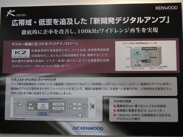 また、同社独自の補完技術である「K2テクノロジー」により、CDなどの音源もサンプリング周波数は88.2/96kHzまで 量子化ビット数は24bitまでに拡張でき、よりマスター音源に近い音質で再生できる。