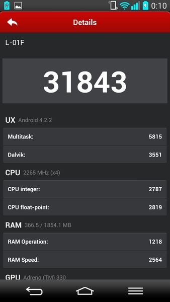 搭載するOSは、Android 4.2。LGホームは際だったカスタマイズというよりも、デフォルトに粒の揃った機能を多く用意して、使い勝手を向上させている。主だった機能を挙げてみると、ゲスト用の設定ができるホームスクリーン。これは人に見せる用として活用できる。上記しているが、画面を2回タップでロックを解除するノックオン。画像やメモをリアルタイムで共有するVuTalk、アプリを切り替えるスライドウィンドウ、ウィンドウで複数のアプリを実行できるQスライド、Qリモート、Qメモ、耳を当てると受話になるアンサーミーがある。いずれも変にでしゃばるタイプの機能ではなく、さりげなく使えるのがいい。