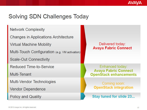 このFabric ConnectをOpenStackでコントロールできるように、アバイアではNeutronコンポーネント(OpenStackでネットワーク管理を担うコンポーネント)にSPB対応のためのコードを追加した。AvayaのオーケストレーションスイートはこのOpenStackを中核として、パフォーマンス管理などの付加的なツールも含め単一のダッシュボードを提供する。