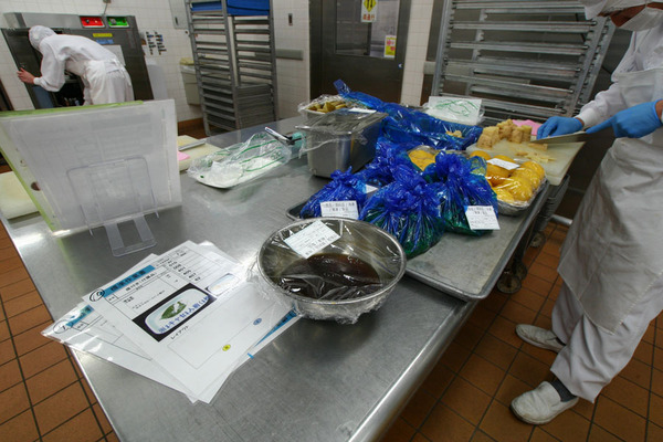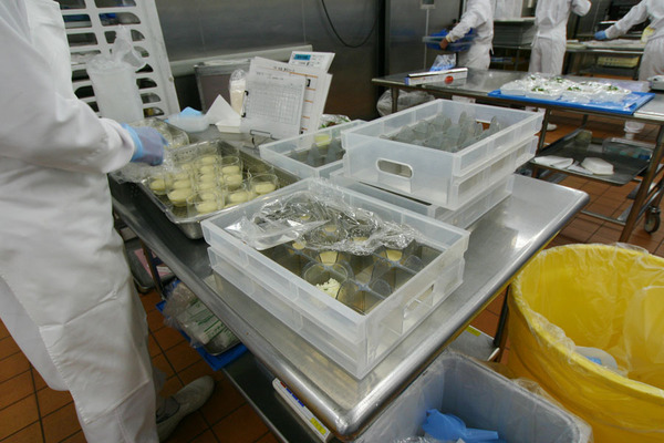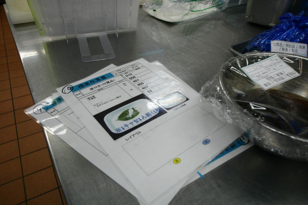 調理のスタートは材料を切ったり、調味料に漬け込んだり、材料を和えたりというコールドキッチンから始まる。6人掛けの会議室テーブルのような調理台には、袋に入った素材や、あらかじめ下ごしらえされた材料などが入っており、これをマニュアルに従って調理する。