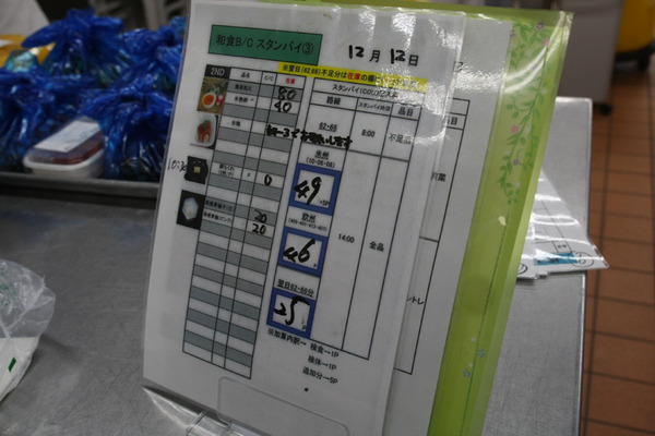 各調理台には、調理手順を示す標準作業書と、何時までに何便には何食必要かが書き込まれた数量表もある。こうして搭乗客の数に合わせて過不足なく作っていくのだ。
