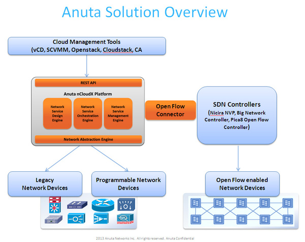 米アヌータ・ネットワークスが開発するAnuta nCloudXは、既存のネットワーク機器をそのまま利用し、ソフトウェアでネットワークの構成/制御を柔軟に行えるようにすることで、SDN(Software-Defined Network)を実現するソフトウェア。IaaS事業者がグラフィカルな画面で設計したネットワークサービスを、テナントのユーザーにサービスカタログとして提供し、ユーザーが選択したサービスを実現するための各種ネットワーク機器設定を自動的に実行する(関連記事)。