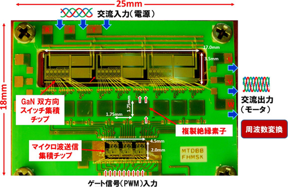 開発された電力変換装置は磁界共鳴方式によるワイヤレス電力伝送技術を応用したもので、高電圧で動作する双方向型GaNパワーデバイスと、マイクロ波による非接触電力伝送を用いた絶縁ゲート駆動回路を半導体チップに集積化。入力した交流を別の振幅・周波数の交流に直接電力変換する。