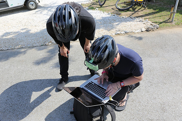 撮影方法としては、まずは6台のカメラの無線LANをオン。リモコンの電源を入れるとカメラと通信して、台数の確認が始まる。6台を認識したらリモコンの録画ボタンを押して、ランプで動作を確認。あとは一脚を持ち、回転や伸縮して、後処理のきっかけをつくるために周囲の特徴的な風景を納めて、撮影をスタートすればいい。なお、この動画作成には、GLOBAL SYSTEMの中谷孔明さんが機材で、ユニティ・テクノロジーズ・ジャパンの伊藤周さんが画像合成でそれぞれ協力している。