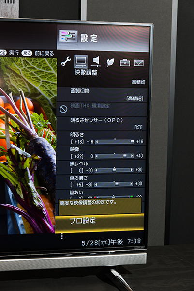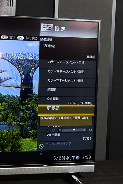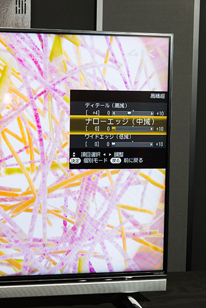 周波数(高域は細かなディティール、低域や中域は輪郭線)ごとに、アップスケーリングの強度を調整できる点は、4K AQUOSならではのこだわり。内部の処理だけでなく、ユーザーにメニューとして解放することで、マニアックな設定ができるようにしている