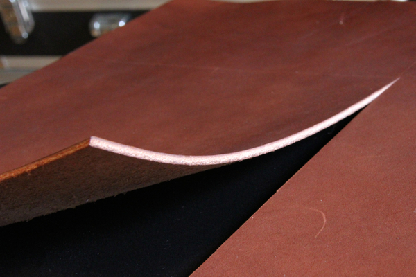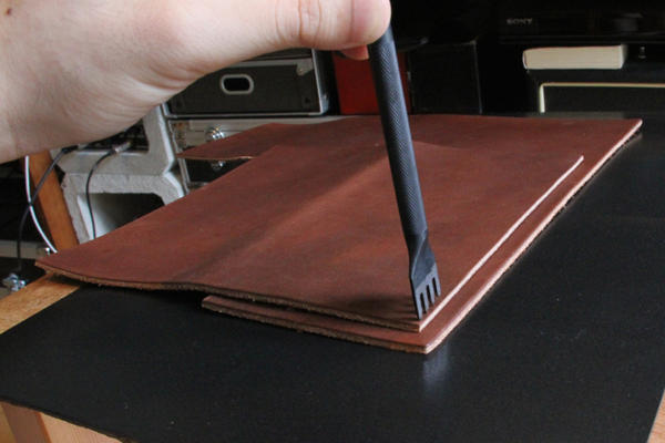 「Xperia Z Ultra」ケースの切り出し終えたら、「菱目打ち」という道具を使って縫い代に穴を開けていく。「切ったんだから縫えばいいんじゃないの?」といったところだが、革はそういかない。あらかじめ穴を開けておかないと、針が通ってくれないのだ。