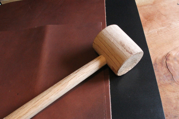 菱目打ちで穴を開けるには、ハンマーを使う。革に垂直にあてて、位置を決めたら、力を込めて何度か叩く。このとき、菱目打ちが革を貫通するので、下には革の切れ端や、穴の空いてもいい作業用マットなどを敷いておこう。平均的な成人男性の力でそれほど苦戦しないはずだが、そこそこ力は要る。
