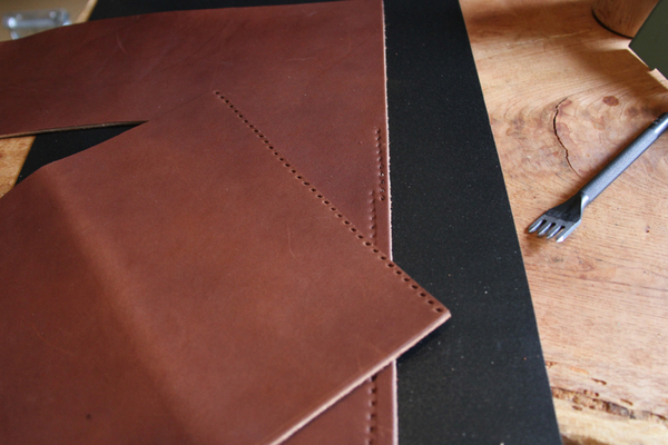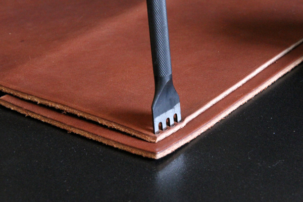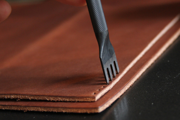 穴を空開たら、4つの穴のうち1つに菱目打ちを指した状態で位置を合わせる。こうすることで真っすぐに穴を開くのだ。もっと正確に、丁寧に作る場合は、時間はかかるが、4つのうち3つに刺した状態で打っていってもいい。