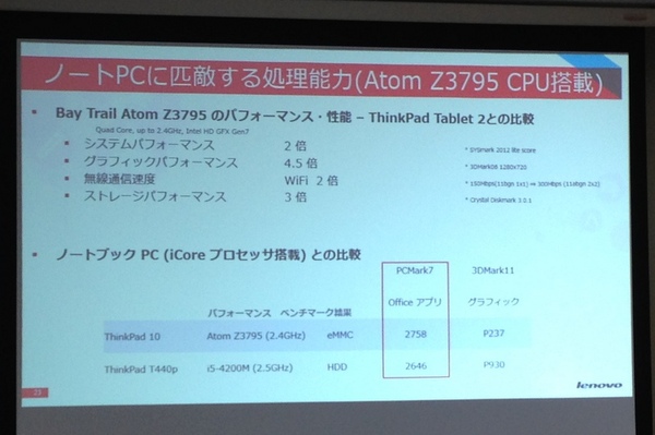 仕事をこなせるパフォーマンスと使い易さという点では、パフォーマンスの向上が挙げられる。CPUはAtom Z3795(1.59GHz、最大2.4GHz)。ThinkPad Tablet 2との比較で、システムパフォーマンスが2倍、グラフィックスが4.5倍、Wi-Fi通信速度が2倍、ストレージパフォーマンスが3倍という結果が出ている。