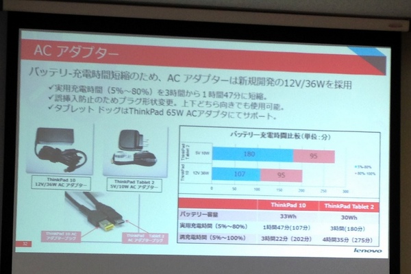 一方キーボードケースに関しては、Pogo PinインターフェースでUSB 2.0接続する。従来はBluetooth接続だったが、企業で大量導入する際にはペアリング作業に手間がかかるため、USBとした。また今回からACアダプターはMicro-USBではなく、専用コネクターになった。これは充電時間を短縮するためだ。USBは10Wまでという制約があり、5%→80%の充電に3時間かかっていたが、ThinkPad 10では36Wのアダプターを使用し、100分で80%充電できるようにした。裏表がわかりにくく差しにくいという点も初心者が含まれる企業ユーザーにとってメリットになるという。
