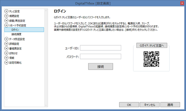 リモート予約を行なうためには、テレビ番組表配信サービス「Gガイド.テレビ王国」のユーザー登録(無料)が必要。ユーザー登録完了後、DigitalTVboxの設定画面からユーザーIDとパスワードを入力し、サーバーへの接続頻度を設定すればOKだ。これで「ESPRIMO WD2/R」が休止状態やスリープ状態でも自動的に復帰し、リモート予約の内容が反映される。