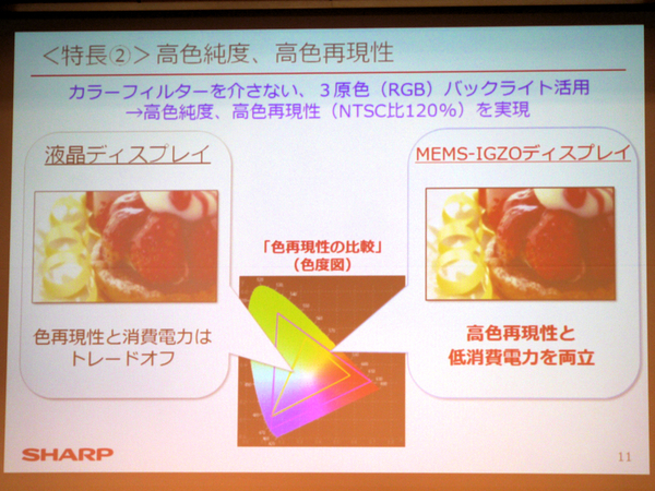 そして、MEMS-IGZOディスプレイの最大の特徴は、表示コンテンツのカラーに応じてMEMSシャッターの駆動スピードを落とすことで、消費電力を最適化できる点。これも低消費電力化に寄与する」という。