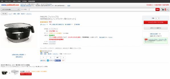 問題はバスケットです。新型は焦げ付きにくく、分解式で洗うのも簡単でよろしいわけですが、旧型はそうではない。しかしラッキーなことに、このバスケットはオプションとして売られており、旧型のノンフライヤーと互換性があるので、差し替えて使えます。お値段5000円程度。旧型ノンフライヤーと合わせて買うと、だいたい2万2000円くらい。微妙に安いわけですね。