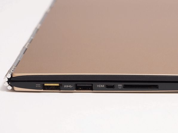 インターフェースは本体左側面に、USB 3.0端子およびUSB 2.0端子、microHDMI端子、4 in 1メディアカード・リーダーが搭載している。このうち、USB 2.0端子は電源コネクターと兼用になっており、ACアダプタを接続すると電源が供給され、USB機器を接続するとUSBポートとして機能する仕組みになっているのがおもしろい。また、本体右側面にはPowerd USB 3.0端子、ヘッドフォン/マイク端子などを搭載している。