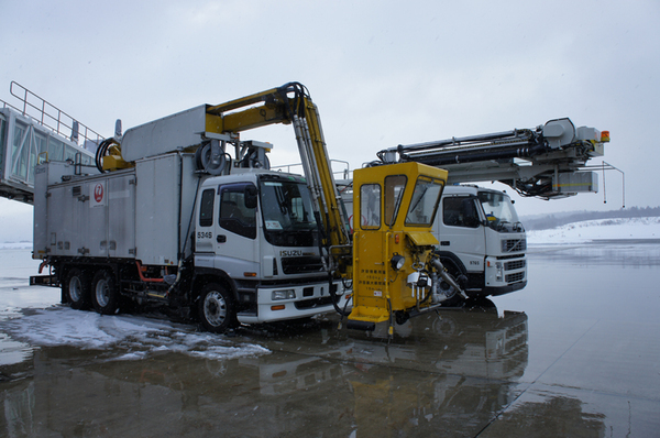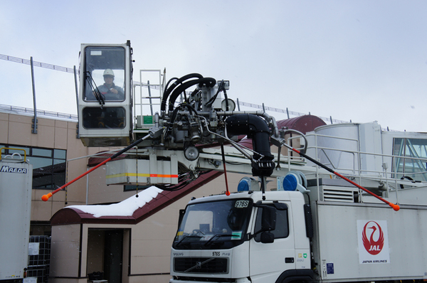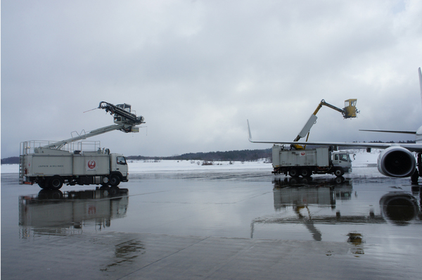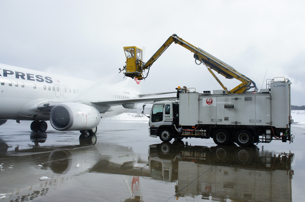 ディアイシング・アンチアイシングは「ディアイシングカー」という作業車を使用しておこなう。JALは青森空港に「ELEPHANT-BETA」と「534S」と呼ぶ2台のディアイシングカーを所持している。ELEPHANT-BETAはタイプ1、タイプ4、水が入った3つのタンクを、534Sはタイプ1とタイプ4が入った2つのタンクを搭載する。2台とも、ディアイシングとアンチアイシング両方の作業が可能だ。